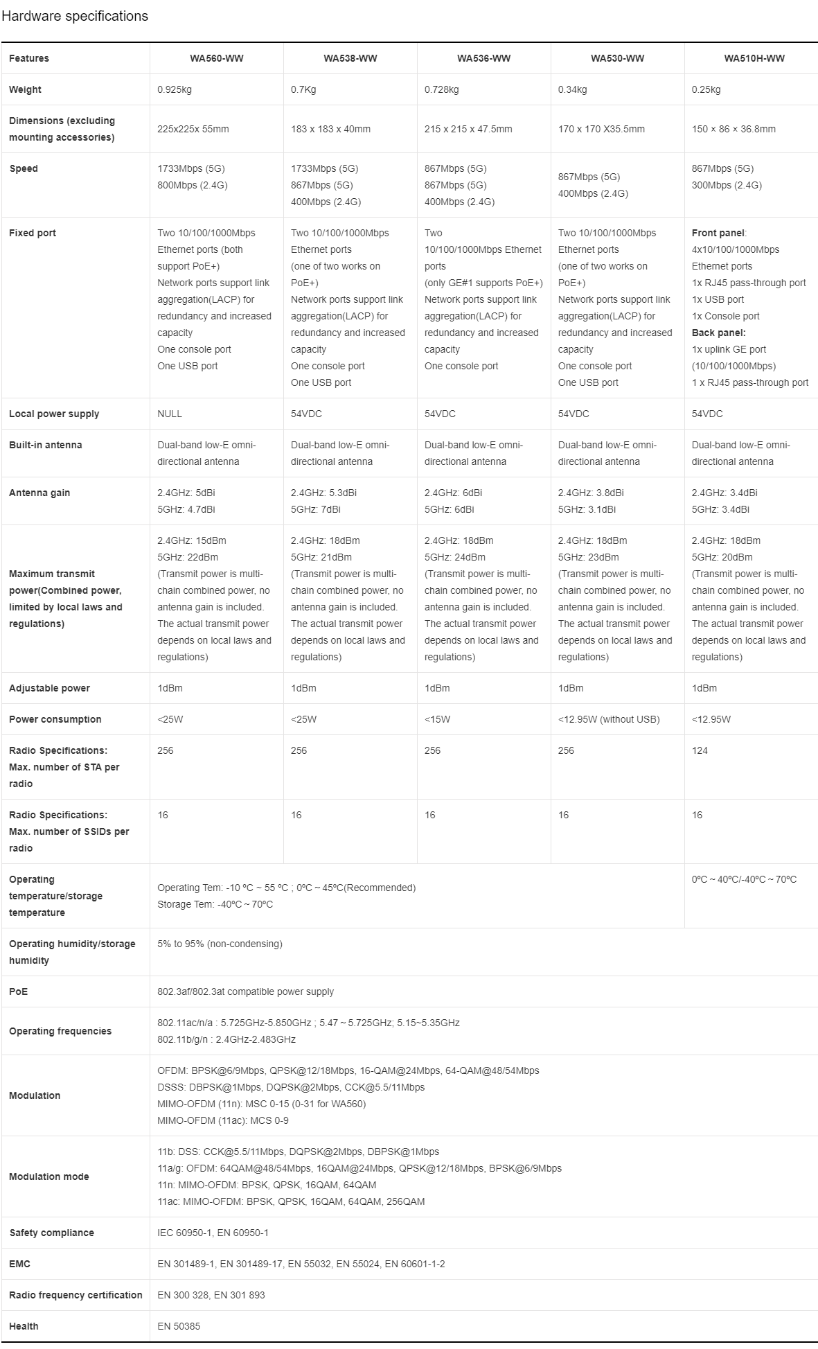 H3C 802.11ac Wave2 series AP complies with 802.11ac Wave2 standard and features maximum four streams 1733Mbps wireless transfer rate for 5GHz (WA560 and WA538) and total 3Gbps speed of combining 2.4GHz and 5GHz (WA538). With the smart adaptive antenna array technology, it can increase the scope of coverage, improve access density and operation stability, and provide a better mobile cloud access and wireless network total cost of ownership (TCO). The WA500 series is available for easy maintenance and management from the H3C Oasis cloud platform.